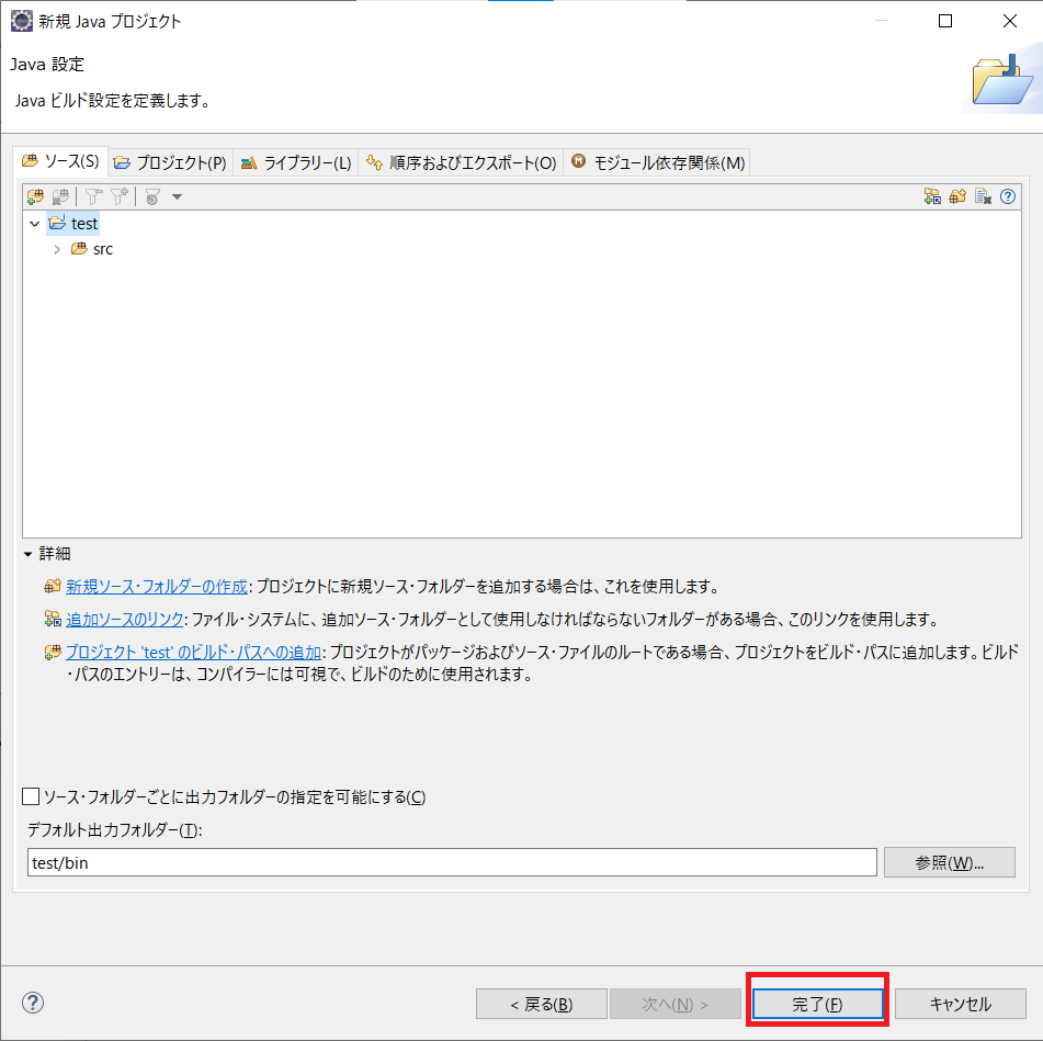 画面が閉じられ、パッケージエクスプローラーに「test」プロジェクトが新規作成されていることが確認できました。
