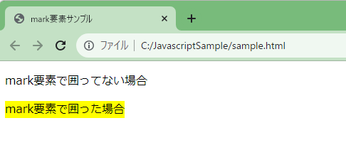 <!DOCTYPE html> <html> <head> <meta charset="UTF-8"> <title>mark要素サンプル</title> </head> <body> <p>mark要素で囲ってない場合</p> <p><mark>mark要素で囲った場合</mark></p> </body> </html> |