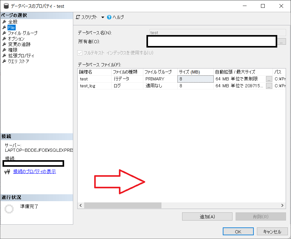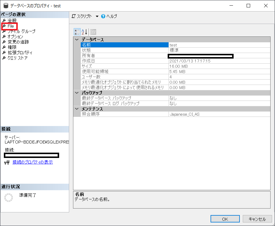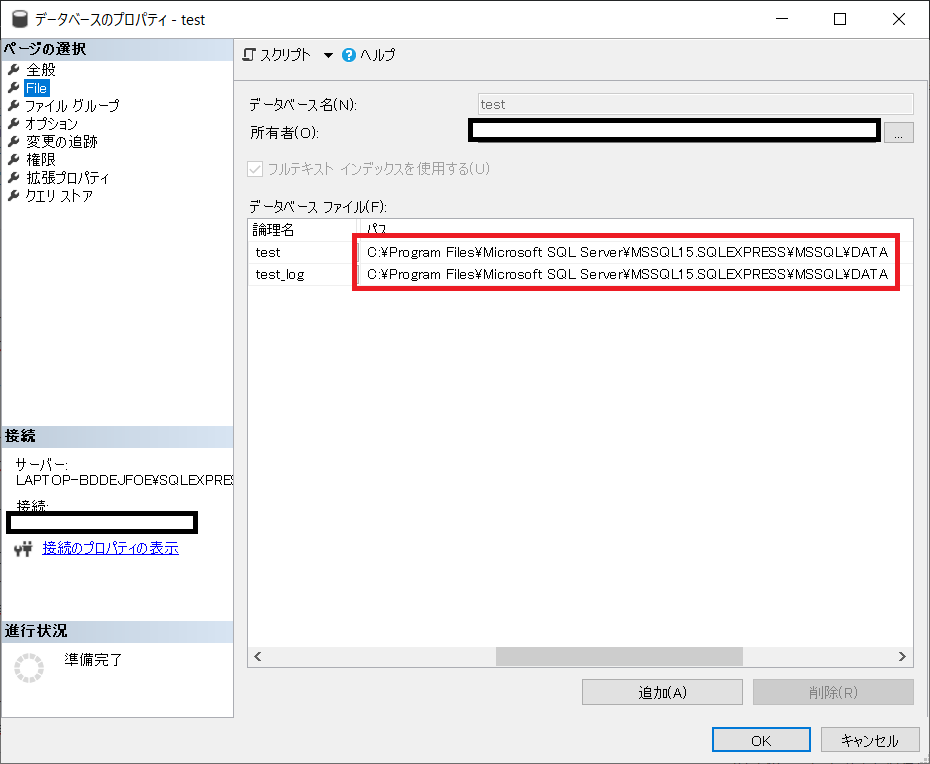 下の画像のように、【パス】項目でデータベースファイルとログファイルの場所が確認できます!