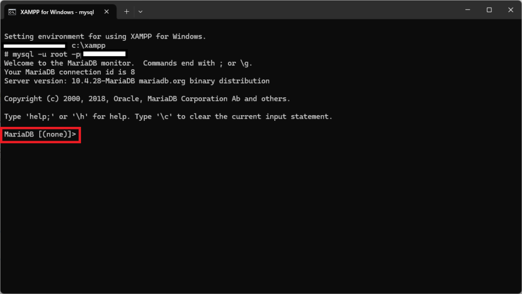 # mysql -u root -p******** Welcome to the MariaDB monitor. Commands end with ; or \g. Your MariaDB connection id is 8 Server version: 10.4.28-MariaDB mariadb.org binary distribution Copyright (c) 2000, 2018, Oracle, MariaDB Corporation Ab and others. Type 'help;' or '\h' for help. Type '\c' to clear the current input statement. MariaDB [(none)]> |