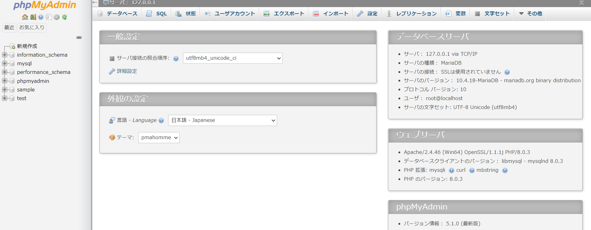 phpMyAdminを起動するやり方は、以下の記事をご参考ください。